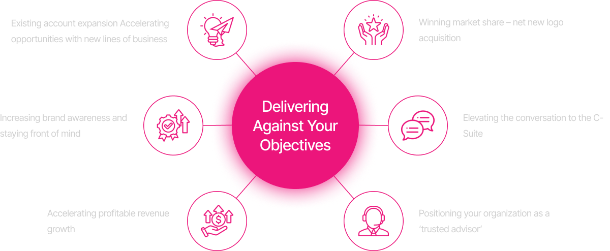 We understand the importance in getting facetime with the right executives, within your key accounts. Our tailored solutions are completely bespoke with each client, designed only when we’ve taken the time to fully understand your offering, business focuses and business outcomes.